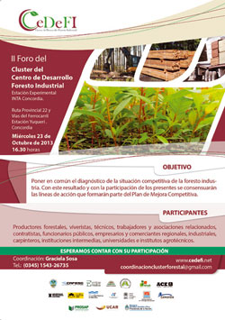 El miércoles 23 de octubre a las 16.30 hs se realizará el II Foro del Cluster Forestal del CeDeFI. Tendrá lugar en la Estación Experimental Agropecuaria INTA Concordia, ubicada en Ruta Provincial Nº 22 y Vías del Ferrocarril, Concordia.