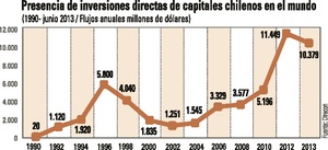 Y considerando desde 1990 a junio de 2013, el stock de inversión chilena directa materializada en el exterior alcanzó US$86.058 millones, distribuidos en más de 70 países. Un número superior a las 1.000 empresas ejecutan más de 2.500 proyectos.