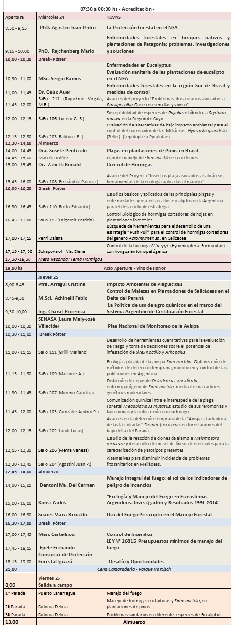 En las jornadas que están organizando; por iniciativa de la Unidad de Cambio Rural del Ministerio de Agricultura de la Nación; se seleccionaron cuatro áreas temáticas que abarcarán las mismas: plagas y enfermedades; impacto ambiental, manejo del fuego y control biológico por considerar a todas de real impacto en la sanidad de los bosques forestales nativos e implantados. Durante las dos primeras jornadas se realizarán las presentaciones programadas mientras que para el último día se encuentra previsto una salida a campo a fin de conocer algunos de los problemas sanitarios del sector y su efecto en plantaciones, como así también una práctica de manejo del fuego.