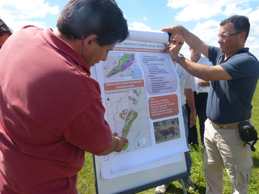 Por la tarde, se realizaron recorridos de campo con dos paradas en la Estancia “Santa Julia”, una en la Reserva Iberá, con la mirada ambiental de Gustavo Aparicio, director de Conservación de la Fundación Hábitat y Desarrollo, sobre cómo sería la forestación ideal en el Litoral. Si bien la Reserva Natural es provincial, las tierras que la componen pertenecen en su mayoría a propietarios privados y las actividades productivas que se desarrollan en ella -como la forestación, la agricultura y la ganadería- se encuentran reglamentadas, ya que en 2009 se definieron los límites del área protegida a través del Decreto Reglamentario 1440/09 y se establecieron dos zonas: reserva natural y parque provincial, regulándose las actividades a desarrollarse en cada uno.