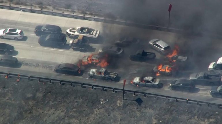 ESTADOS UNIDOS (17/07/2015).- El fuego de los incendios forestales saltó hoy por encima de la autopista incendiando más de 15 autos en la autopista interestatal de California.