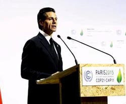 Al presidir la segunda sesión de trabajo de esta cumbre, el presidente de México, Enrique Peña Nieto, recalcó que se debe entender que en la COP21 debe decidir en qué mundo queremos vivir, y qué calidad de vida queremos para el siglo XXI”. México cree que «es posible crecer económicamente y cuidar del medioambiente al mismo tiempo», según declaró Peña Nieto, al intervenir en la inauguración de la conferencia sobre el cambio climático de la ONU (COP21) de París.