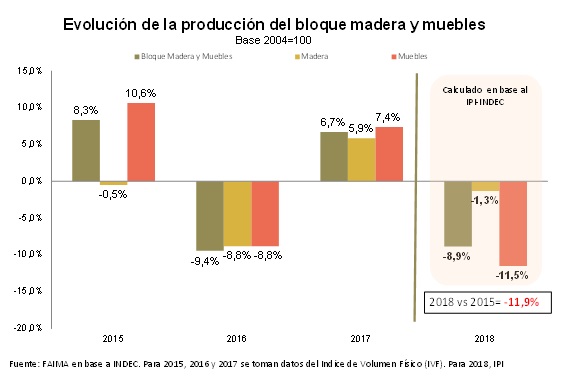 Según el informe estadístico y la encuesta anual del Observatorio PyME (OIMyM) de la FAIMA, la evolución del sector arrojó números negativos, «sin precedentes». La producción de madera y muebles se contrajo un 8,9% en 2018. En diciembre, la producción de muebles se contrajo un 37,5% y la de madera y manufacturas de madera un 16,7%.