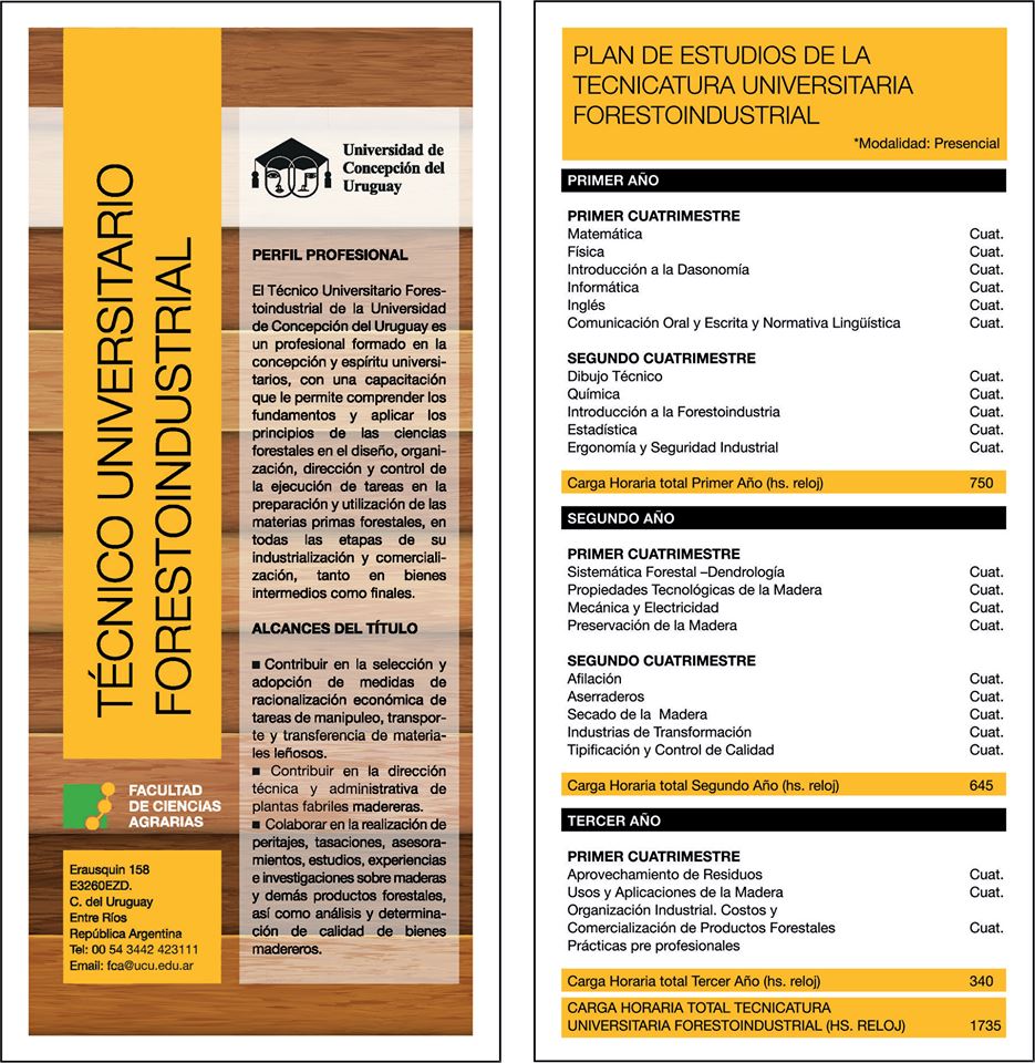 Definición: El Técnico Universitario Forestoindustrial de la Universidad de Concepción del Uruguay es un profesional formado en la concepción y espíritu universitarios, con una capacitación que le permite comprender los fundamentos y aplicar los principios de las ciencias forestales en el diseño, organización, dirección y control de la ejecución de tareas en la preparación y utilización de las materias primas forestales, en todas las etapas de su industrialización y comercialización, tanto en bienes intermedios como finales.