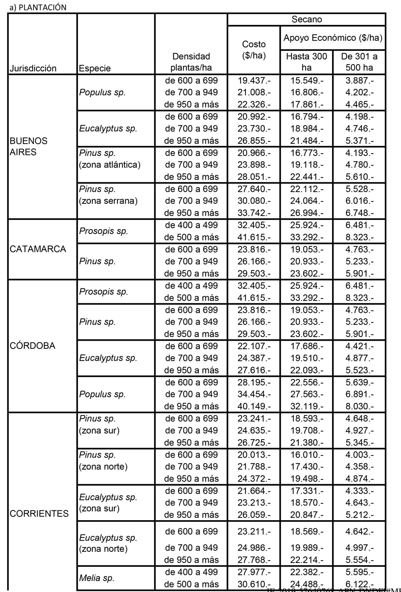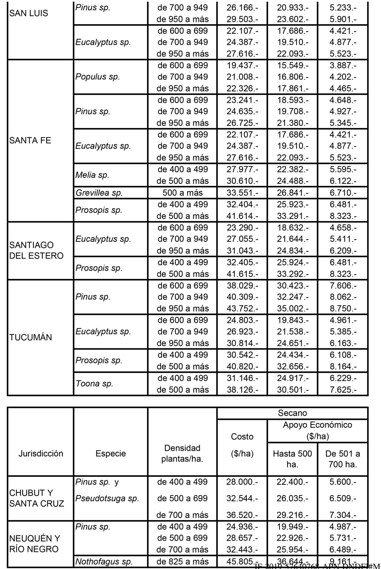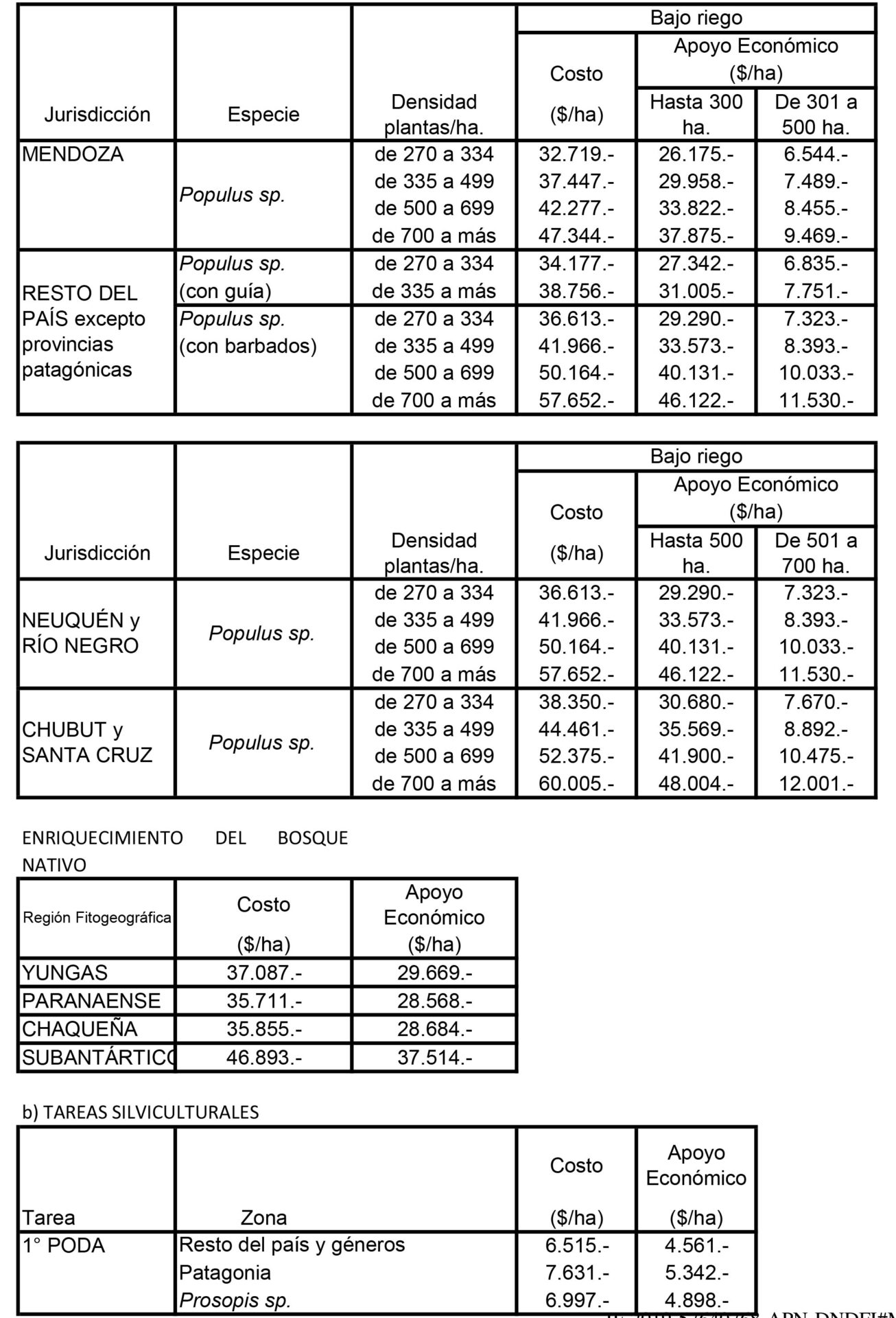 -Que la mencionada Ley Nº 25.080 en sus Artículos 17 y 18 establece que dicho apoyo económico no reintegrable consistirá en un monto por hectárea variable por zona, especie y actividad forestal, según lo determine la Autoridad de Aplicación y conforme a escalas de porcentajes en función de los costos de plantación y tratamientos silviculturales.