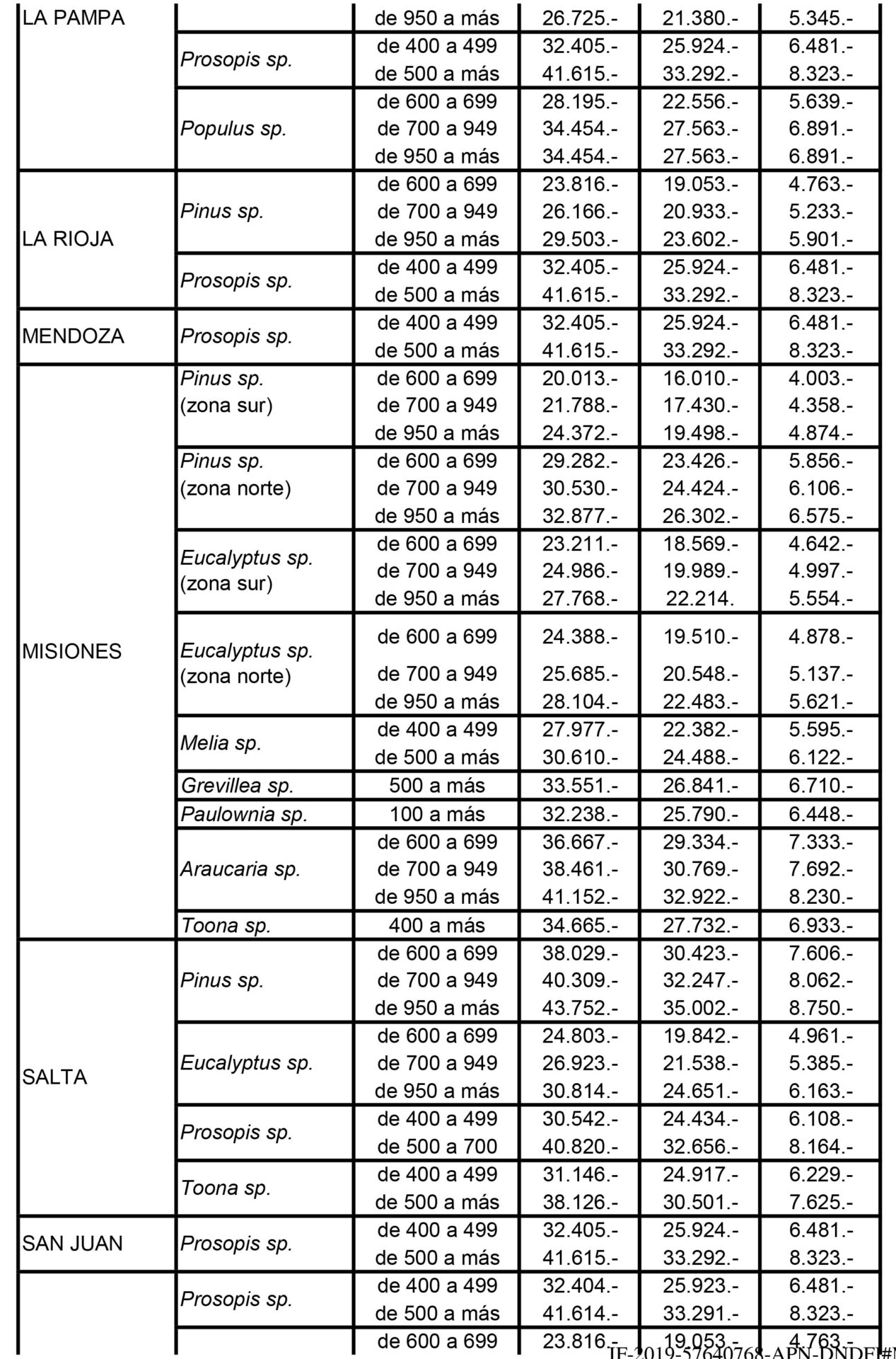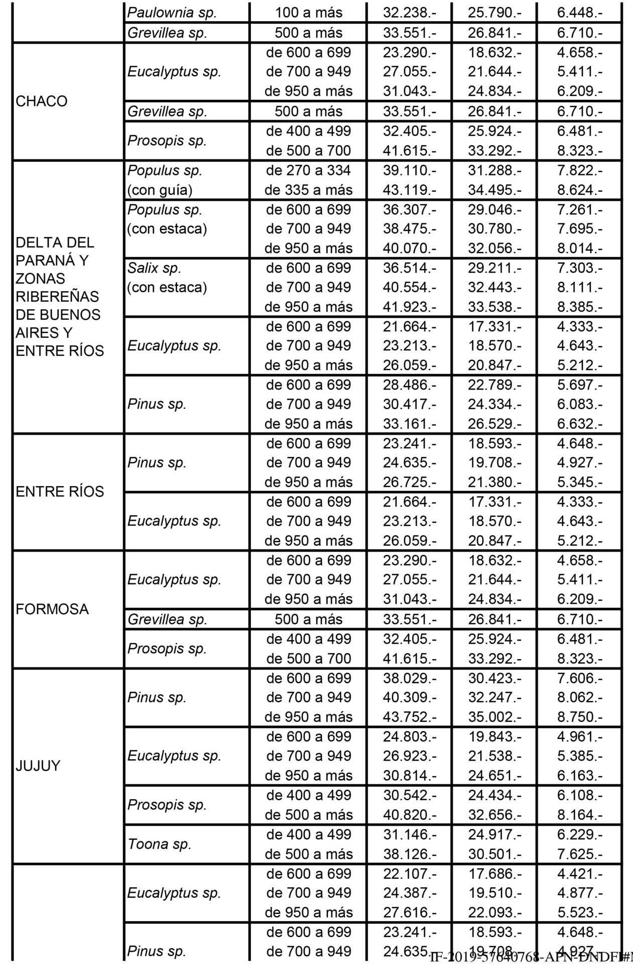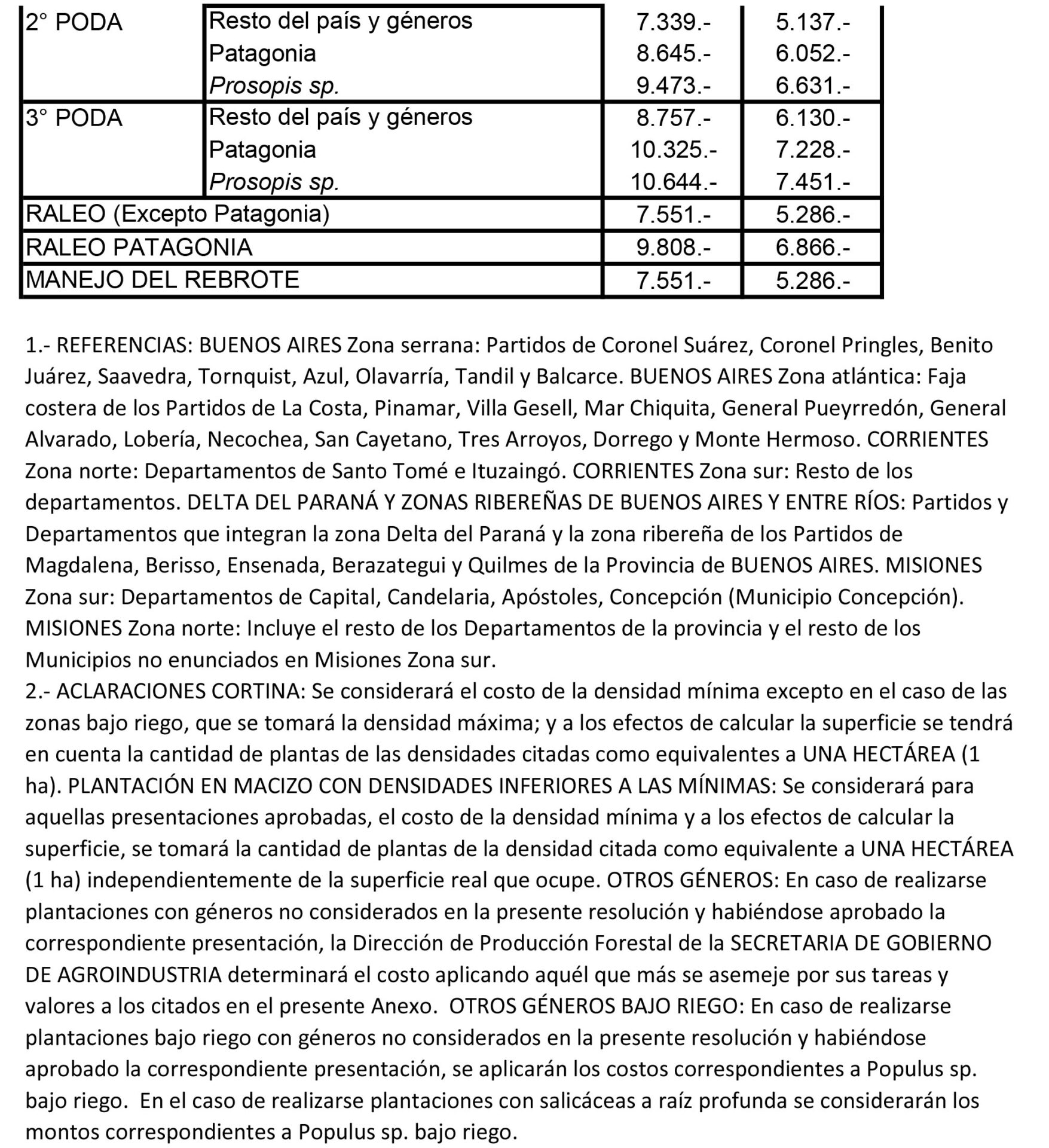 -Que por todo lo expuesto es apropiado describir con mayor nivel de detalle la información del esquema de costos de implantación y tratamientos silviculturales tal como se expone en el Anexo que, registrado con el N° IF-2019-57640768-APN-DNDFI#MPYT forma parte integrante de la presente resolución, separando los datos correspondientes a la implantación en zona de secano de los correspondientes a la implantación