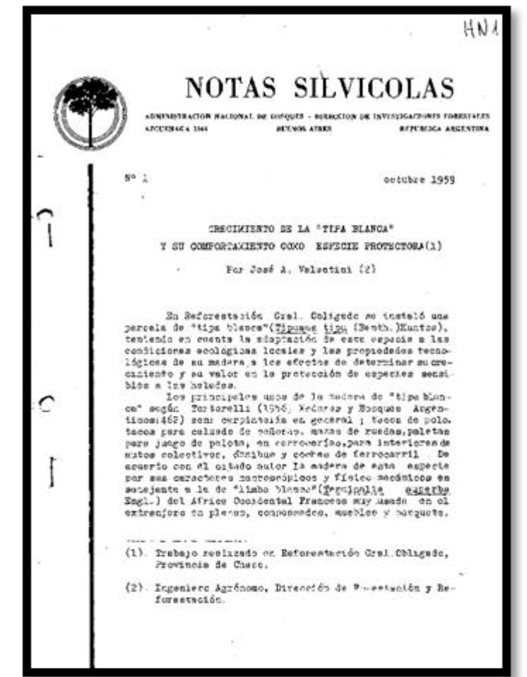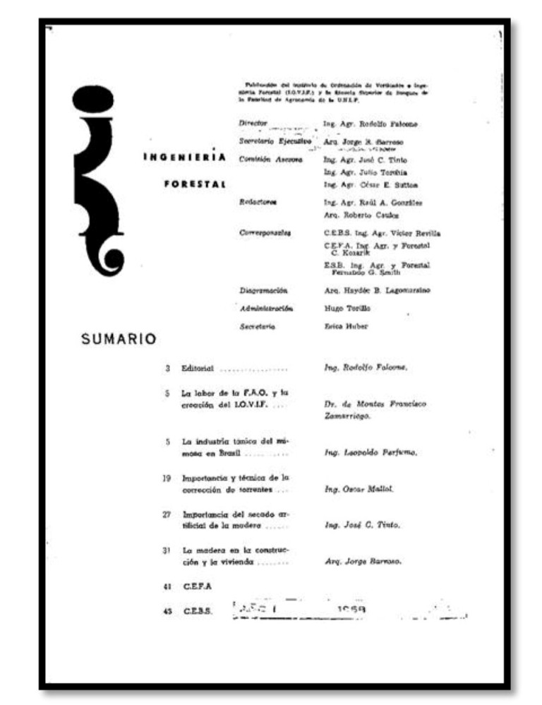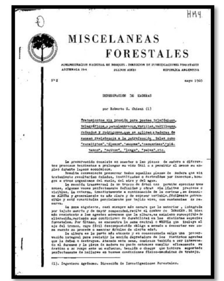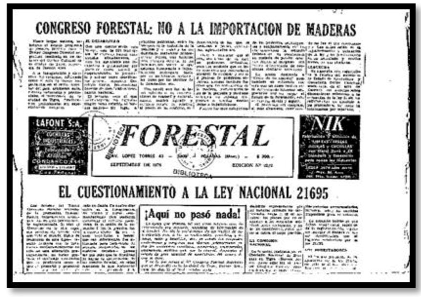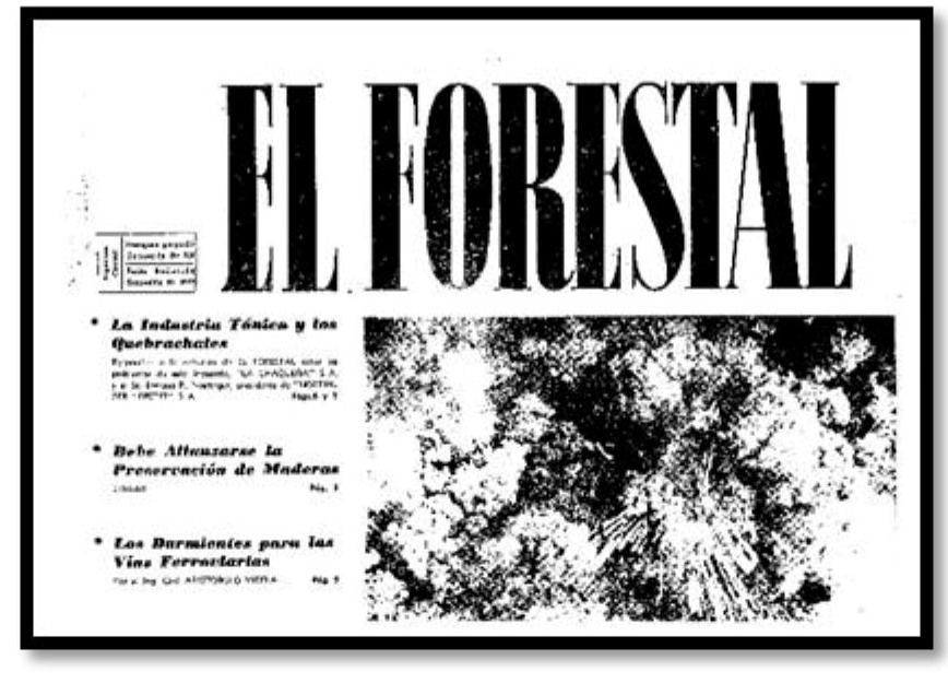 Periódico mensual misionero que aparece en 1976 fundado por el Sr. Ricardo Torres. Trataba los aspectos de la forestación, extracción y comercialización de maderas de Misiones y algunas veces del resto del país. En la última página incluía cotizaciones de la madera. Se edita hasta el año 1984. IDIA. Suplemento Forestal Publicación dirigida por el Ing. Wilfredo Barrett y sus colaboradores del área Fitotécnia Forestal del INTA Castelar. Entre 1957 y 1974 aparecieron 8 números que incluían trabajos científico-técnicos propios del equipo mencionado y ocasionalmente de autores ajenos a esa institución. Informaciones Económicas y Técnicas de la Industria del Extracto de Quebracho.