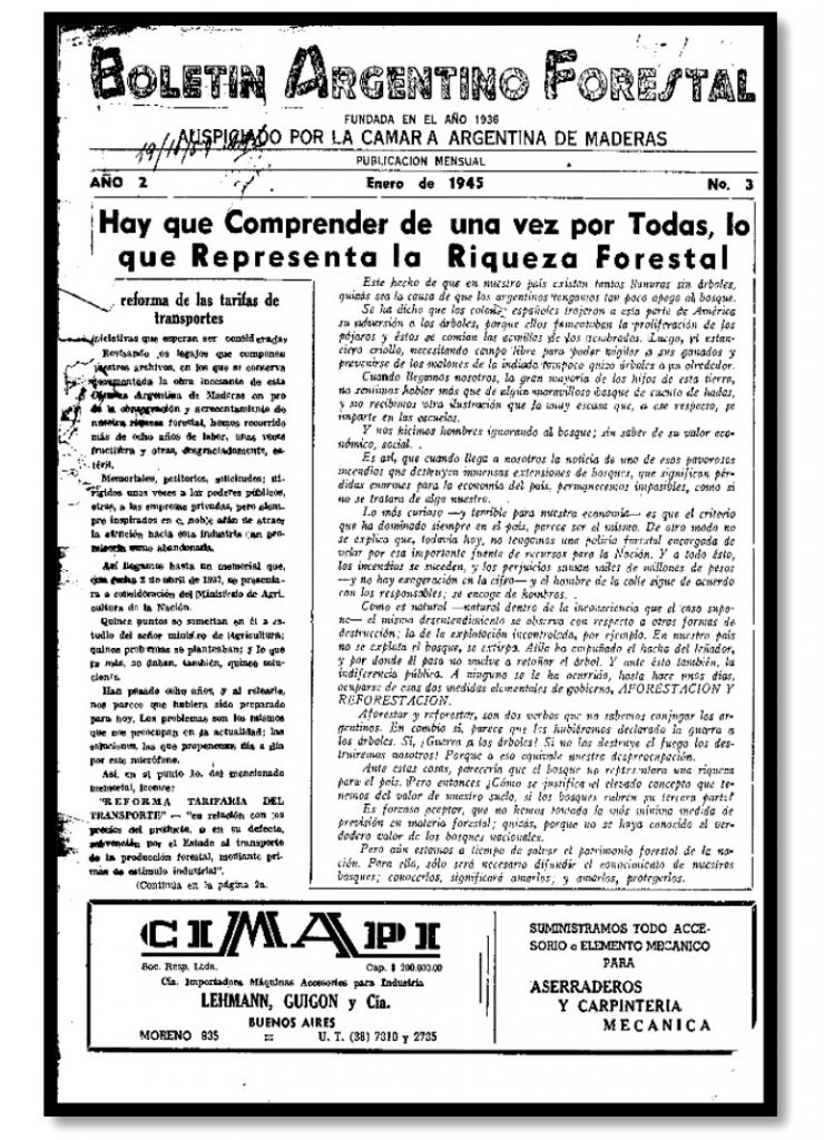 La revista fue fundada el 9 de julio de 1928 por el Sr. Eugenio F. Deymonnaz y si bien comenzó como el “Órgano Oficial de la Bolsa de Maderas”, le pertenecía personalmente. Desde su comienzo la publicación observo un marcado estilo en cuanto a la presentación, regularidad y modalidades de diagramación durante toda su existencia. De aparición mensual presentaba una caratula prácticamente igual a lo largo de todos números, que incluía en su mitad superior, un grabado representando diversos aspectos del bosque, la industria y el comercio forestal, y un obrero portando hacha y casco metálico provisto de alas (representando a Mercurio, el comercio), más otros dos cortando árboles en fila, una planta industrial, un barco, una jangada. Abajo había una fotografía, distinta en cada número, de bosques o tareas forestales. Toda esto estaba enmarcado en una franja de color rosado-rojizo y bermellón después. Hasta mediados de 1937 la revista figura como órgano oficial de la Bolsa de Maderas, pero desaparecida ésta, nace la “Cámara Argentina de Maderas”, con el lema: “Defensor de la industria forestal argentina”.