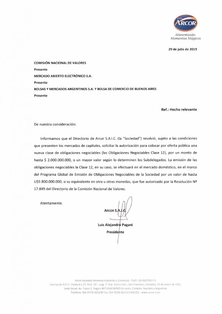 BUENOS AIRES (2/8/2019).- La gigante alimenticia Arcor anunció este martes a la Comisión Nacional de valores que emitirá una nueva serie de Obligaciones Negociables (ON) en el mercado local. Se trata de la primera salida al mercado de la compañía desde que sus resultados comenzaron a dar negativos y, producto de la devaluación, se debilitó su situación financiera.