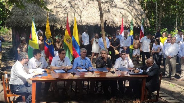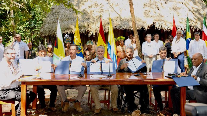 En medio de la emergencia de los incendios forestales se citaron a las puertas de la región, en la ciudad colombiana de Leticia, presidentes y representantes de Perú, Ecuador, Bolivia, Brasil, Surinam, Guyana y del país anfitrión. Los firmantes acuerdan crear una red de cooperación ante los desastres naturales.