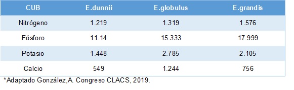 La “eficiencia” con la que distintas especies (dunnii, grandis y globulus) producen madera es evaluada a través del Coeficiente de utilización biológica (CUB), el cual expresa la cantidad de kg de materia seca de madera producida por kg-1 de nutrientes presentes en trozas.
