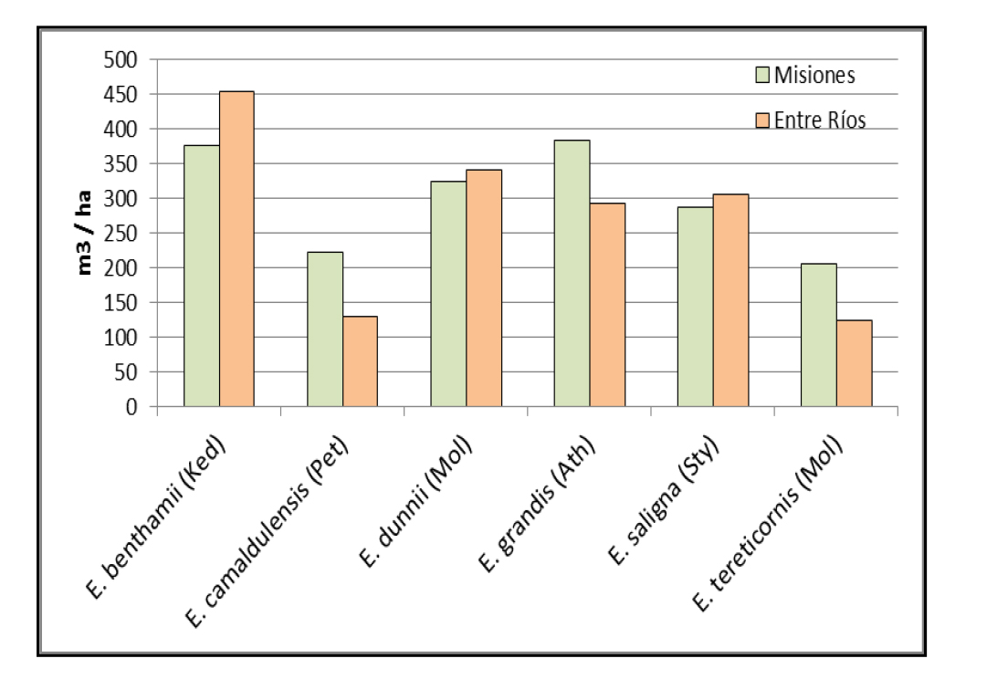 Figura 1. Crecimiento volumétrico total de 7 especies de Eucalyptus en 2 ensayos instalados en Concepción del Uruguay (Entre Ríos) y Cerro Azul (Misiones) a los 10 años de edad.