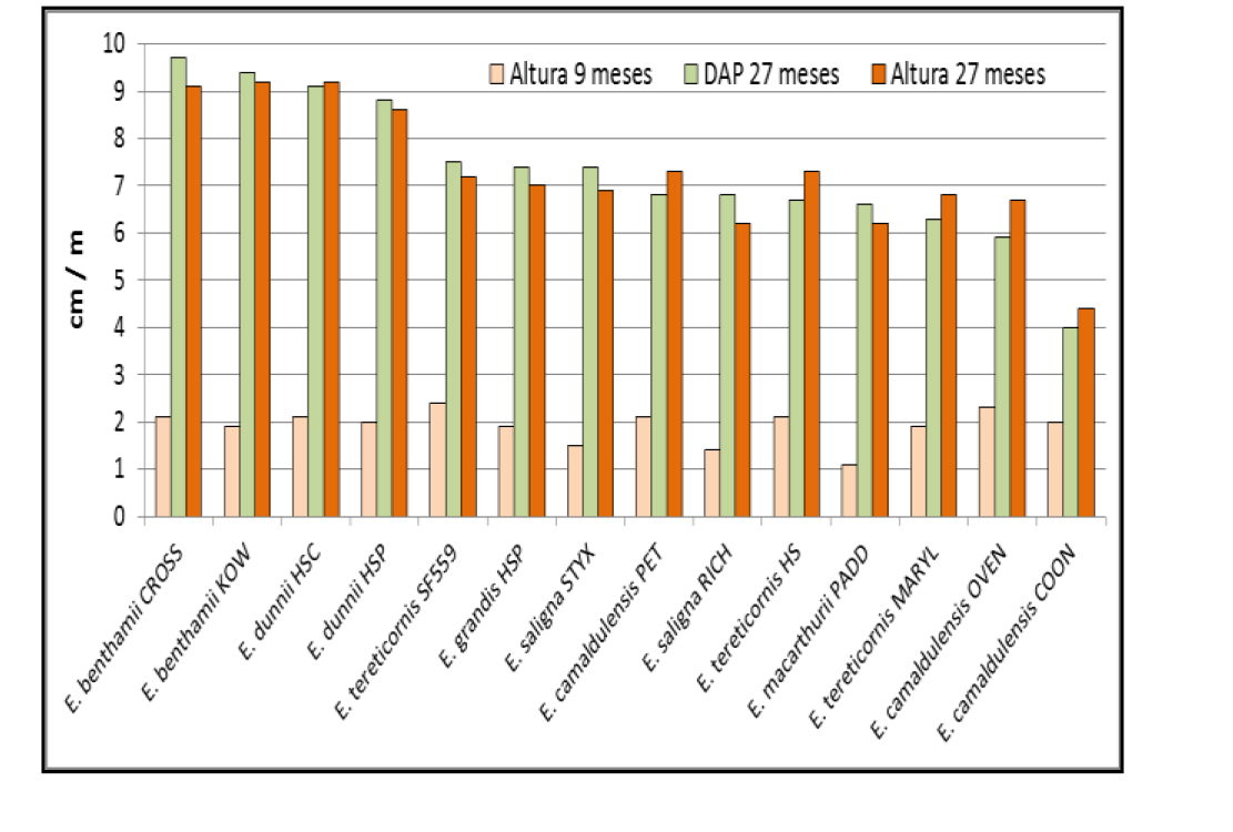 Por otro lado, en los lotes experimentales donde hubo ocurrencia de heladas en los primeros años de crecimiento, E. benthamii demostró su mayor tolerancia frente a las demás, inclusive mayor a E. dunnii, E. camaldulensis o E. tereticornis (Figura 3).
