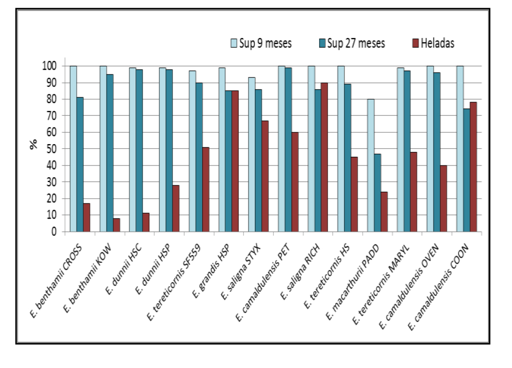 Figura 3. Porcentajes de supervivencia y de plantas afectadas por heladas de diferentes especies de Eucalyptus en un sitio en Ubajay (E.R.) a los 9 y 27 meses de edad.