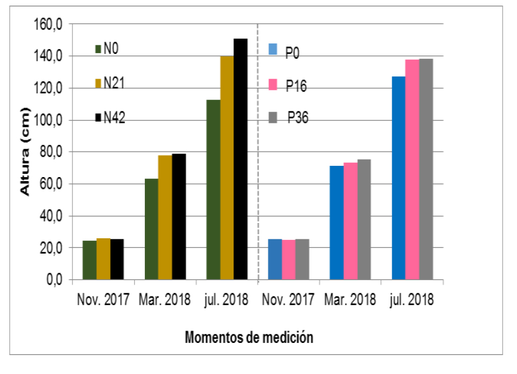 Cuatro meses después se encontraron las mayores alturas en los tratamientos con N, sin haber diferencias significativas entre las dos dosis media y alta (Figura 4). La fertilización