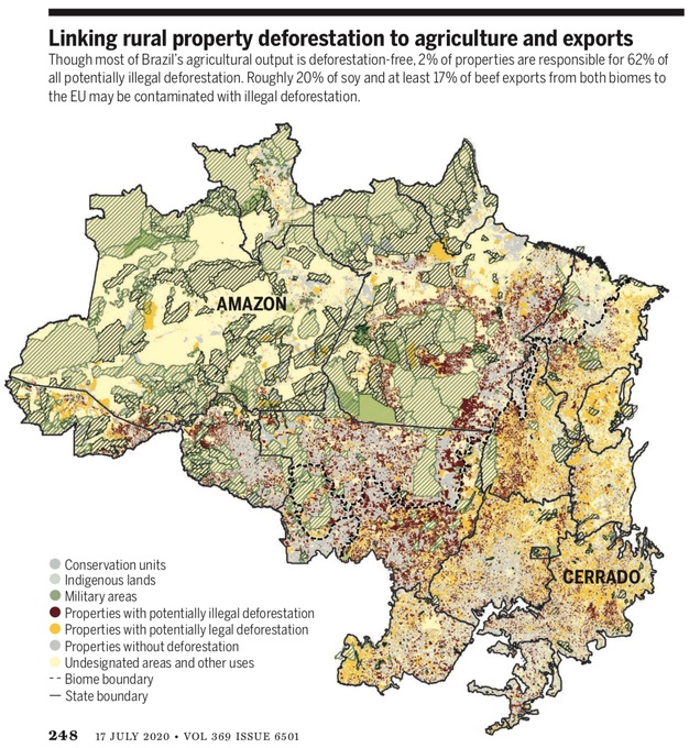 Alrededor de una quinta parte de la carne y la soja que la Unión Europea importa de Brasil cada año se ha comprobado que está relacionado con la deforestación ilegal en la selva amazónica y la sabana del Cerrado, según una investigación publicada recientemente en Sciencie, dirigido por la Universidad Federal de Minas Gerais (UFMG). Al descartar la tala legal de bosques, el equipo descubrió que «en un 20 por ciento de la soja y al menos el 17 por ciento de las exportaciones de carne a la UE estaban asociadas con la deforestación ilegal».