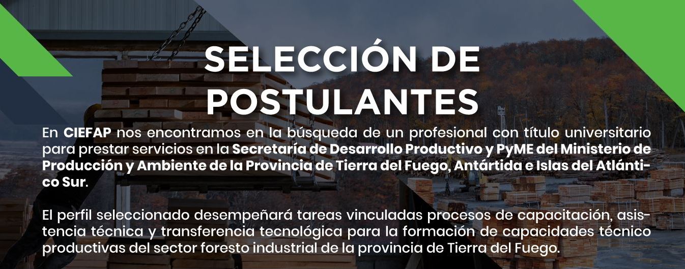 El CENTRO DE INVESTIGACIÓN Y EXTENSIÓN FORESTAL ANDINO PATAGÓNICO (CIEFAP), seleccionará un profesional con título universitario para prestar servicios en la Secretaría de Desarrollo Productivo y PyME del Ministerio de Producción y Ambiente de la Provincia de Tierra del Fuego, Antártida e Islas del Atlántico Sur. Los servicios a prestar se vinculan a procesos de capacitación, asistencia técnica y transferencia tecnológica para la formación de capacidades técnico productivas del sector foresto industrial de la provincia de Tierra del Fuego.