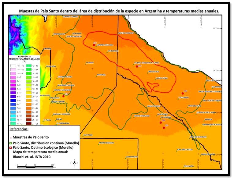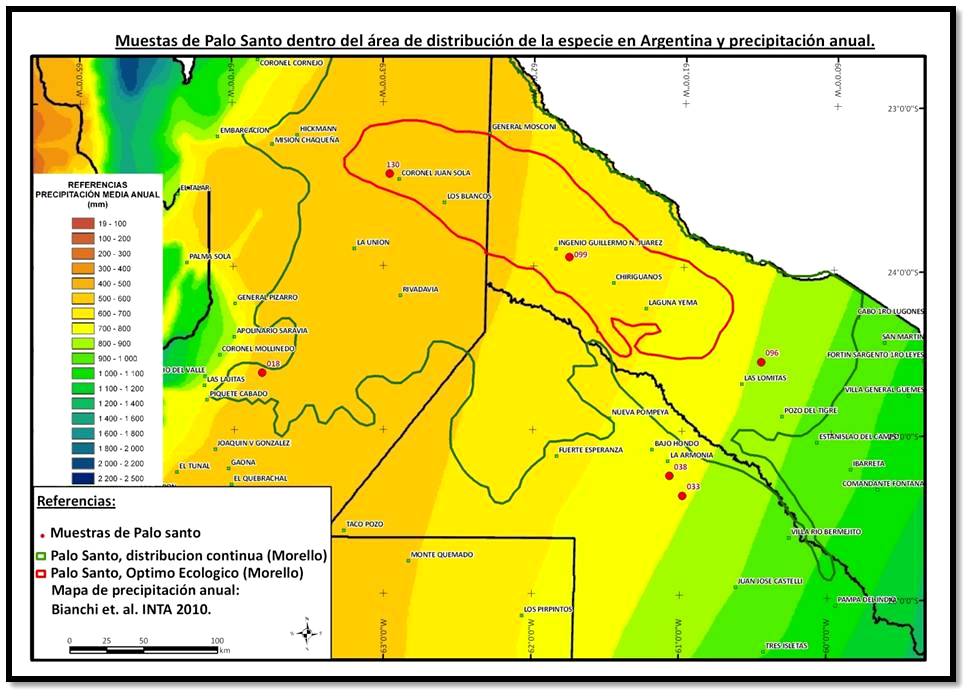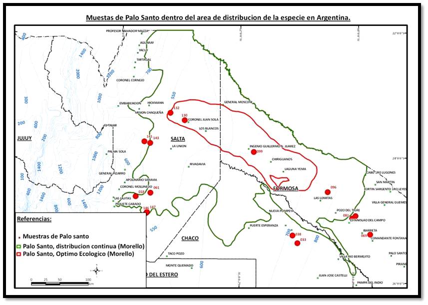 En este estudio se tomaron muestras de Gonopterodendron sarmientoi de 6 sitios, dos por provincia). En base al mapa de distribución (Figura 1) de palo santo en Argentina (Morello y Adámoli, 1968), se seleccionan tres áreas de muestreo en las provincias de Chaco, Formosa, y Salta.