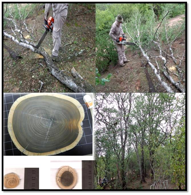 Se trabajó con 6 individuos de Gonopterodendron sarmientoi, colectados dentro de su área de distribución en Argentina correspondientes a: Chaco (2), Formosa (2) y Salta (2). Fueron seleccionas de cada individuo 2 ramas gruesas con duramen de 4 a 10 cm de diámetro y 2 ramas finas de 1 a 3.5 cm de diámetro, sin duramen (Figura 2).