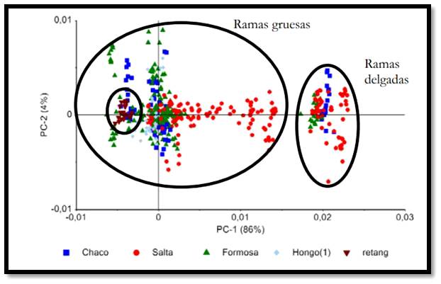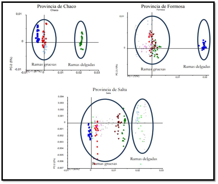 En los gráficos se puede apreciar un comportamiento discriminatorio según el tipo de muestra (rama gruesa o fina). Esto es debe probablemente a que las ramas con menor diámetro no poseen desarrollado el duramen y posen más cantidad de componentes característicos de la albura.