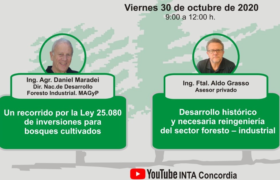 El 5to encuentro de las XXXIV Jornadas Forestales de Entre Ríos contará con las disertaciones del director nacional de Desarrollo Foresto Industrial, Daniel Maradei, y el asesor privado Aldo Grasso.  Será este viernes 30 de octubre, de 9:00 a 12:00 horas, vía YouTube INTA Concordia.