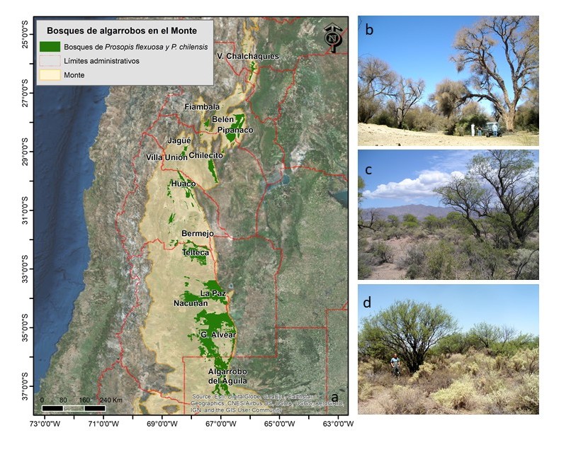 Fig. 1. a) Distribución de los bosques de algarrobos en el Monte. Variación estructural en sentido latitudinal b) Algarrobal en el Bolsón de Pipanaco, Catamarca. c) Algarrobal en el Bolsón de Villa Unión, La Rioja. d) Algarrobal de General Alvear, Mendoza (fotos P. Villagra)