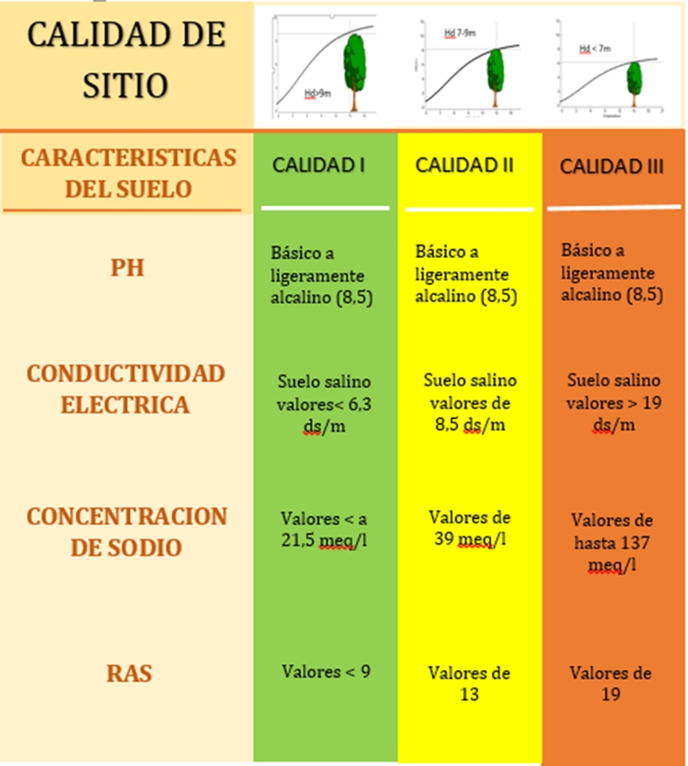 La calidad de sitio I se corresponde con plantaciones en un rango de Hd mayor a 9,2m, que crecen en suelos con pH (8,5) básicos a ligeramente alcalinos, baja CE (6,3 ds/m) y reducida concentración de sodio en horizontes superficiales (21 meq/l).