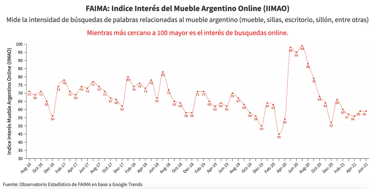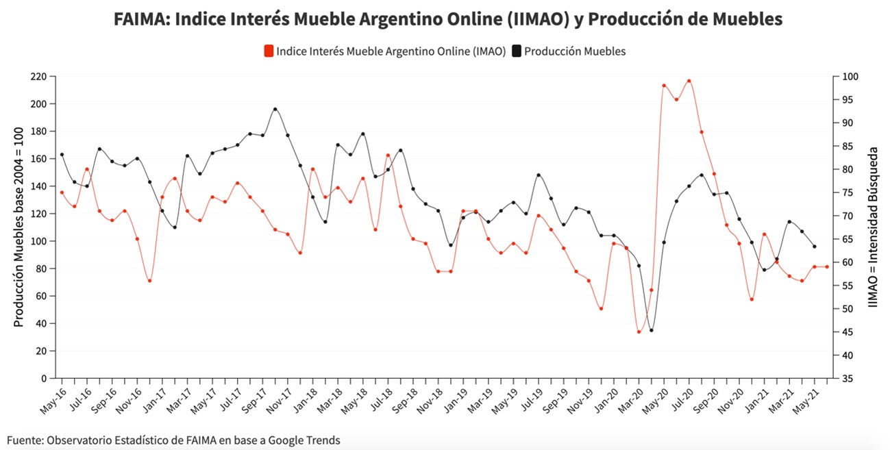 Los datos analizados del Índice Interés del Mueble Argentino online (IIMAO), desarrollado por la Federación Argentina de la Industria de la Madera y Afines (FAIMA), que releva una tendencia del interés por el mueble argentino online a través de palabras clave para la industria. Las búsquedas online de muebles tienen correlación con lo que ocurre con la producción entre uno y dos meses después.