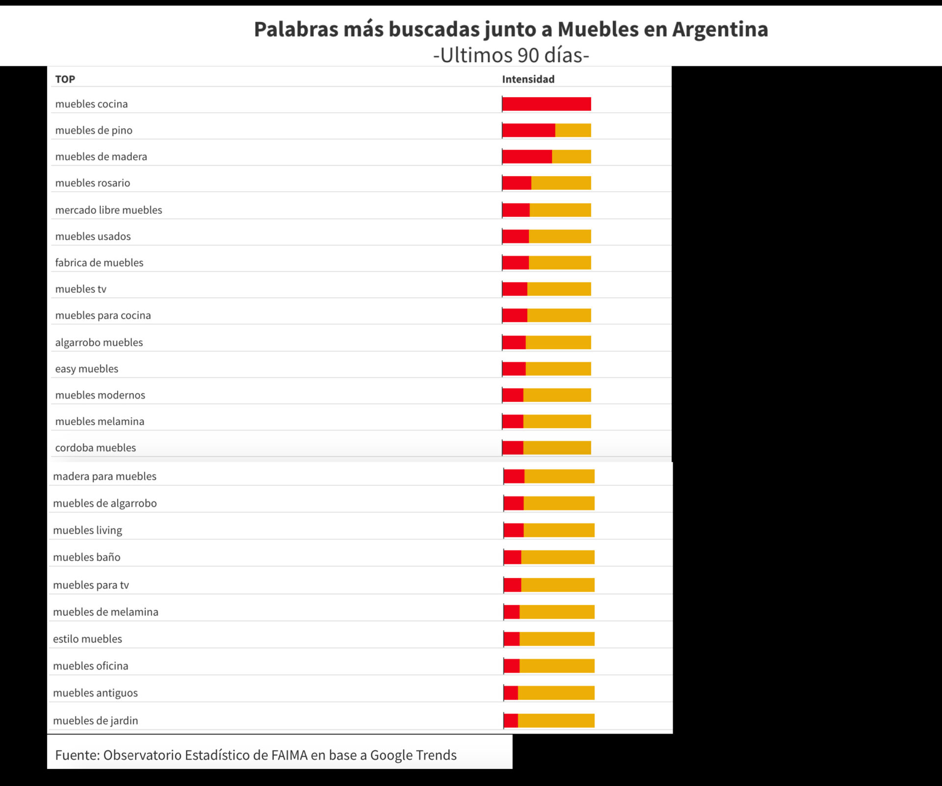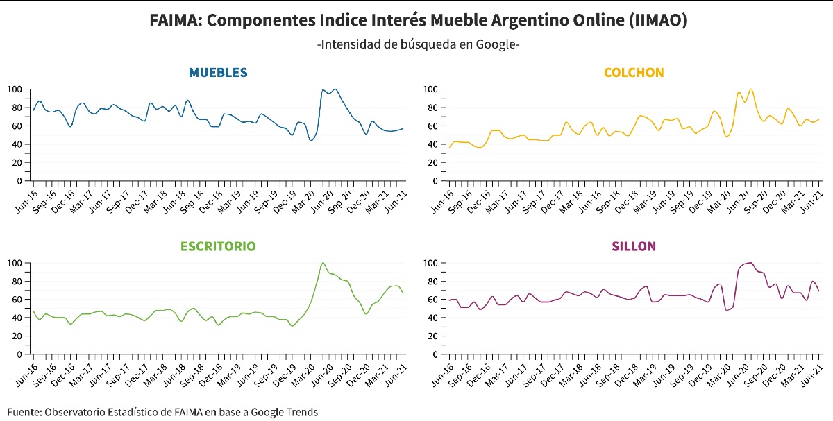 «Se construyó un índice llamado IIMAO «Indice Interés del Mueble Argentino Online» compuesto por las palabras Muebles (80%), Sillón (10%), Escritorio (5%) y Colchón (5%). Las mismas revisten significatividad para la industria y medidas individualmente correlacionan con la producción industrial mueblera», remarca Rondinone.