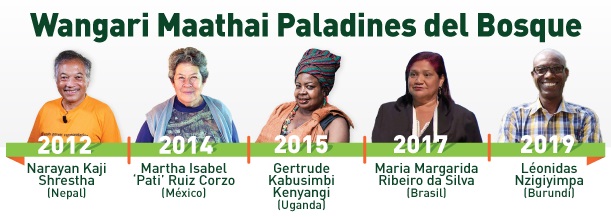 Los ganadores anteriores del Premio Wangari Maathai «Paladines del Bosque» son el líder del movimiento forestal comunitario de Nepal Narayan Kaji Shrestha (2012), la activista ambiental de México Martha Isabel ‘Pati’ Ruiz Corzo (2014), la activista forestal de Uganda Gertrude Kabusimbi Kenyangi (2015), la activista forestal de Brasil Maria Margarida Ribeiro da Silva (2017) y el activista forestal de Burundí Léonidas Nzigiyimpa (2019).