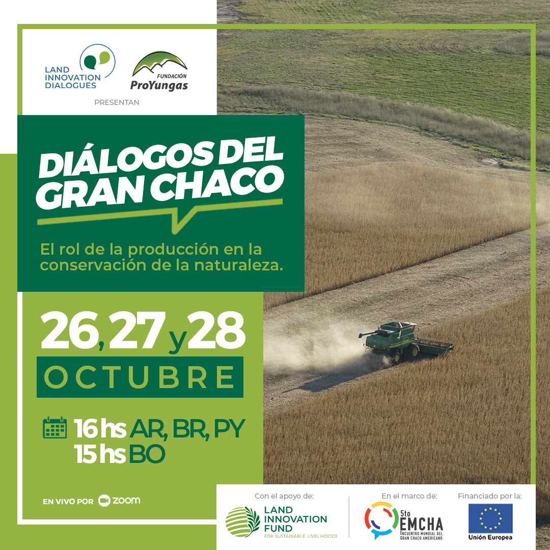 Del 26, 27 y 28 de octubre se realizarán los Diálogos del Gran Chaco, tres encuentros virtuales que buscan generar un espacio de discusión acerca del rol del sector productivo en la conservación de los bienes y servicios ambientales en la región.El evento es organizado por la Fundación ProYungas en el marco del lanzamiento en Argentina de los Land Innovation Dialogues (financiado por Land Innovation Fund) y el 5to. Encuentro Mundial del Gran Chaco (cofinanciado por la Unión Europea).