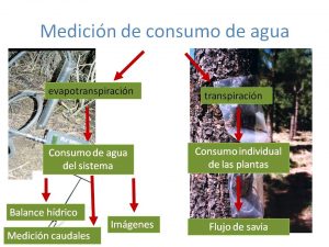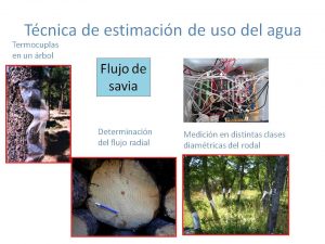 Cuando uno habla sobre el uso del agua de las forestaciones es importante saber que no es un dato estático, sino que depende de otras cosas. Por ejemplo, el uso del agua del lote y/o rodal será muy distinto al momento de plantar que cuando el dosel está completamente cerrado. La cantidad de agua que usa un árbol irá incrementándose en la medida de que el mismo desarrolle su área foliar, y que luego esta tasa de transpiración se modificará de acuerdo a la densidad de árboles y la competencia por los recursos (agua, nutrientes y luz) entre los individuos.