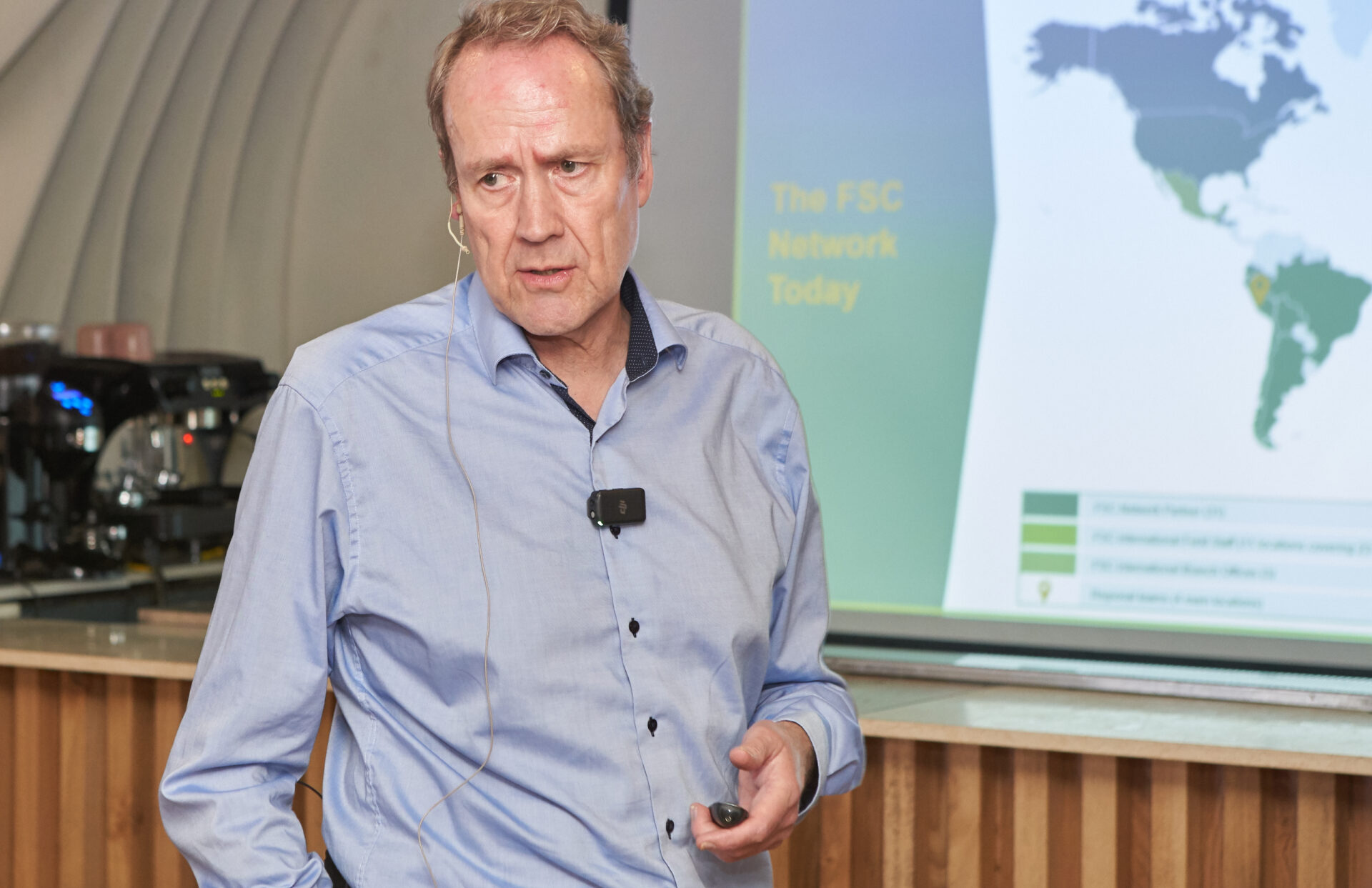 Por la tarde del mismo día, se llevó a cabo un evento en el edificio Patagonia Flooring Design & Art Center, en la cual Kim compartió una presentación introductoria de FSC y luego expuso datos sobre la cantidad de cadenas de custodia certificadas en todo el mundo, el crecimiento sostenido en áreas certificadas y los principales poseedores de licencias de uso de marca.