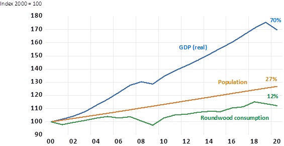 Por ejemplo, entre 2000 y 2020, el consumo mundial de madera en rollo aumentó solo un 12 %, a pesar de que el PIB real creció un 70 % y la población un 27 %.