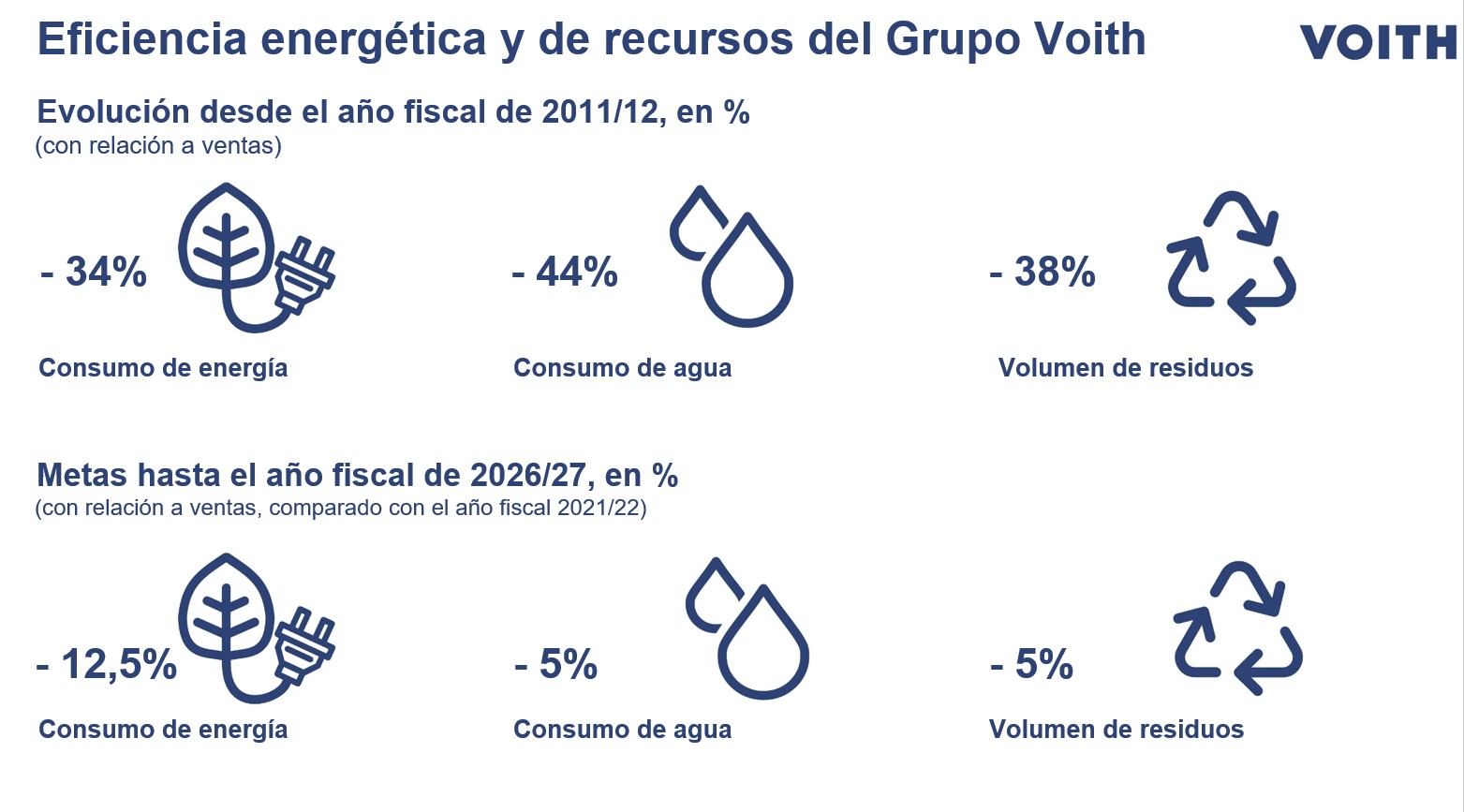 El Informe de Sostenibilidad que publica Voith demuestra que las medidas tomadas en los últimos años están surtiendo efecto. Un ejemplo de ello son las reducciones del 34% en el consumo de energía, del 44% en el uso de agua limpia y del 38% en la generación de residuos respecto al ejercicio de referencia (2011/12).
