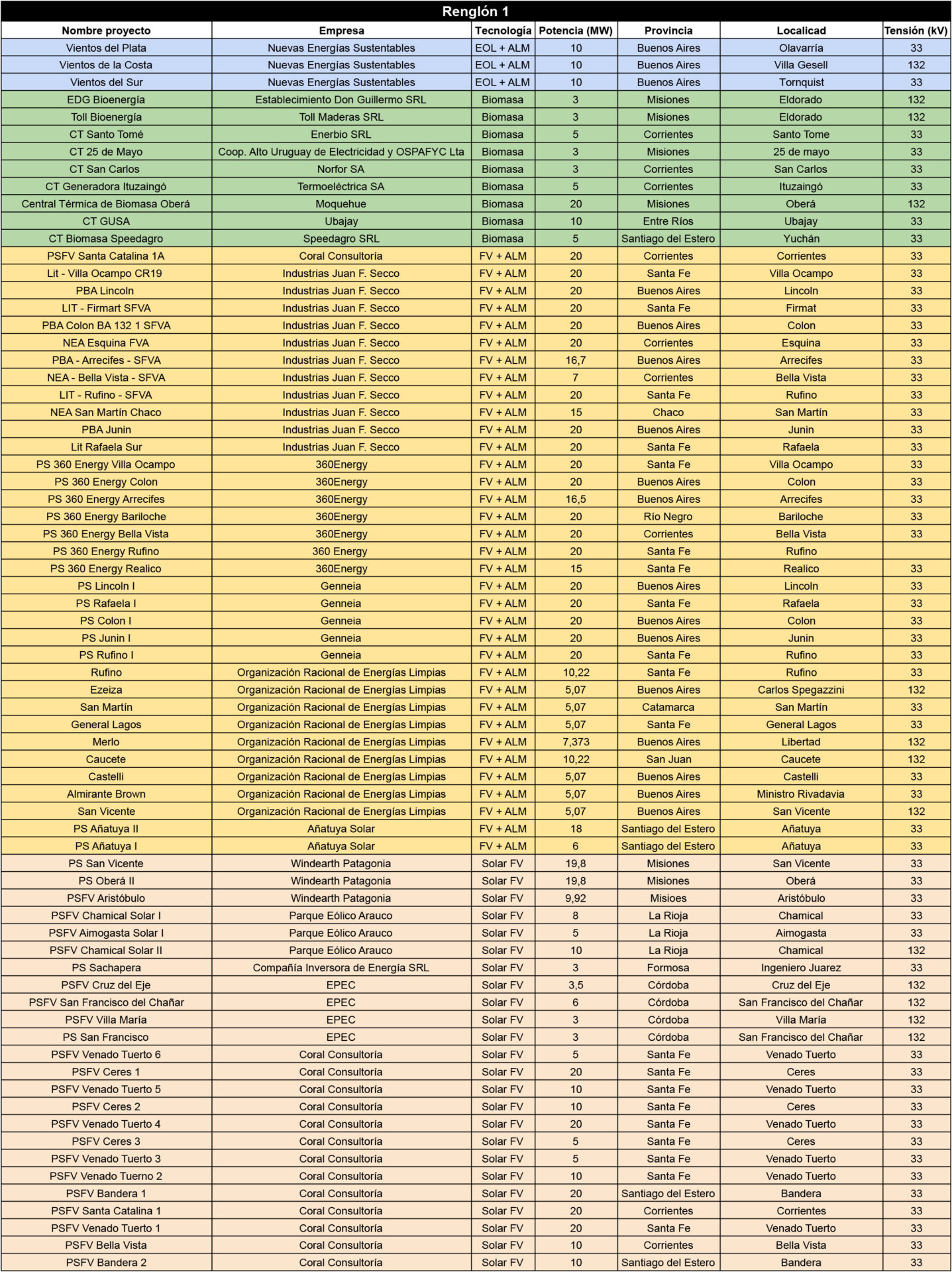 Las autoridades nacionales recibieron 148 proyectos por un total de 1953,8 MW, repartidos de la siguiente manera: 3 parques eólicos con almacenamiento por 30 MW; 9 centrales de biomasa por 57 MW, 35 emprendimientos fotovoltaicos con almacenamiento por 532,5 MW; y 101 plantas solares por 1334,3 MW.