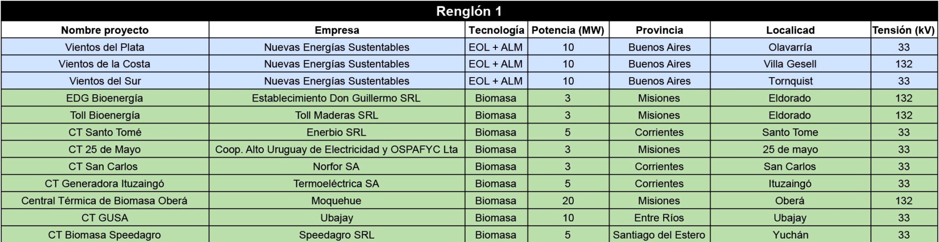 El primer renglón corresponde a proyectos que permitan la sustitución de generación forzada, por una Potencia Requerida Máxima de 500 MW, destinado a las tecnologías de biomasa, solar fotovoltaica con y sin almacenamiento y eólica con almacenamiento. Está reservado a proyectos de carácter regional y provincial, para fortalecer el sistema eléctrico de las provincias.