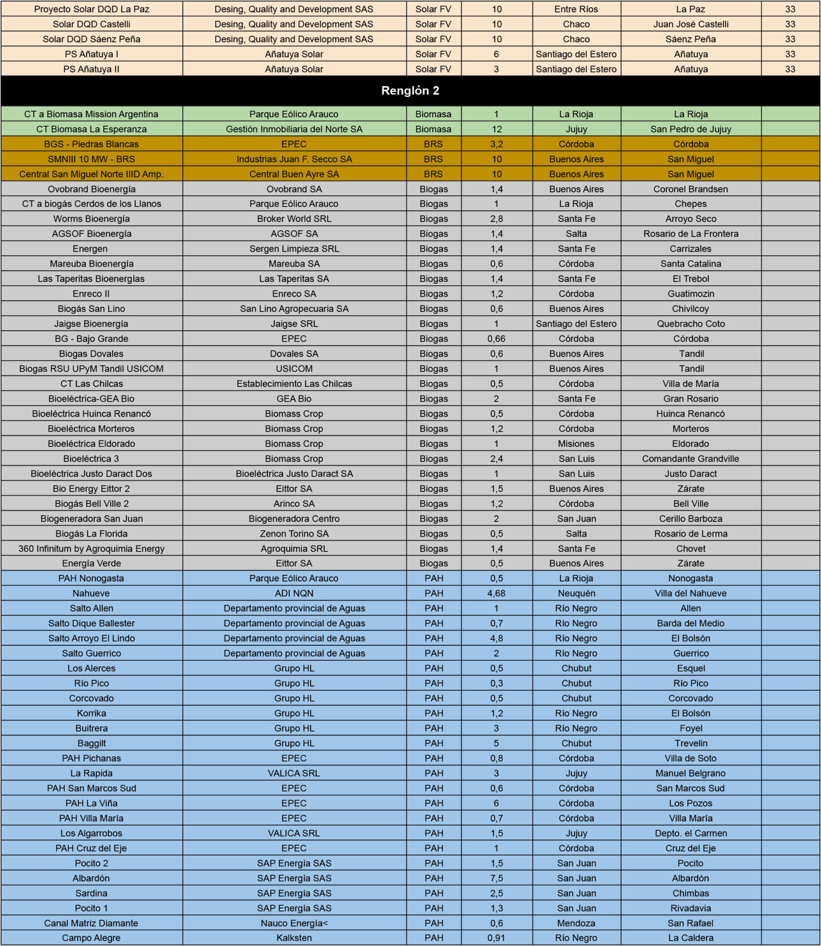 El segundo renglón de la licitación corresponde a proyectos orientado a la diversificación de la matriz energética que permitan incorporar generación renovable de pequeña escala, por una Potencia Requerida Máxima de 120 MW, para las tecnologías de biomasa que no hayan sido adjudicadas en el Renglón 1, de biogás, biogás de relleno sanitario y de pequeños aprovechamientos hidroeléctricos.