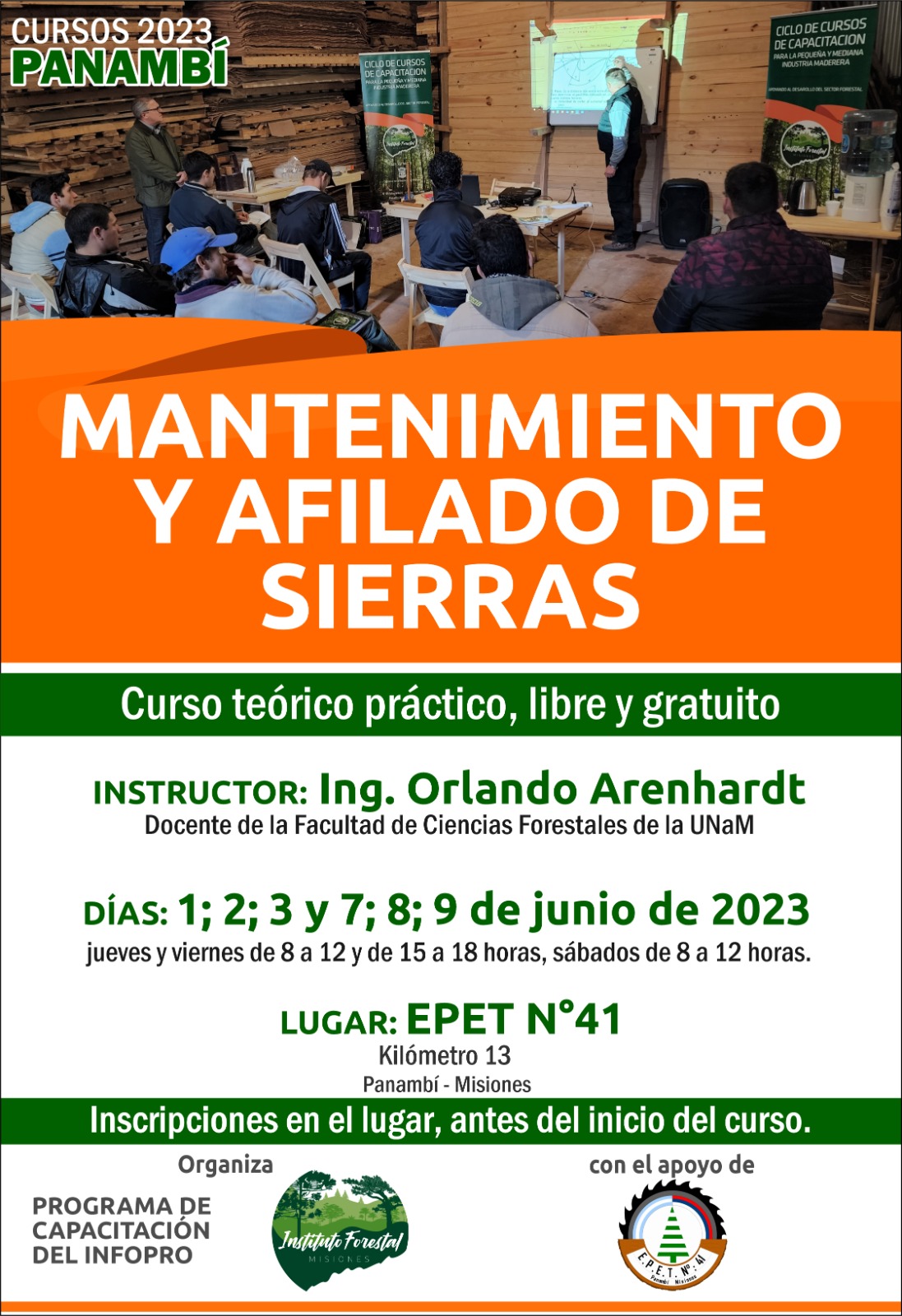 Curso de mantenimiento y afilado de sierras (cinta y circulares) se dictará en la EPET N°41 de Panambí. A cargo del ingeniero Orlando Arehardt, con molidad teórico práctica. Destinado a operarios de aserraderos, estudiantes e interesados en el tema. Es organizado por el Instituto Forestal Provincial (InFoPro).