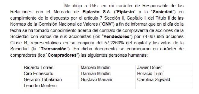 En consecuencia, de acuerdo con la regulación bursátil, los compradores ahora deberán hacer una oferta pública de adquisición por la totalidad de los papeles de Fiplasto que cotizan en la Bolsa de Buenos Aires.