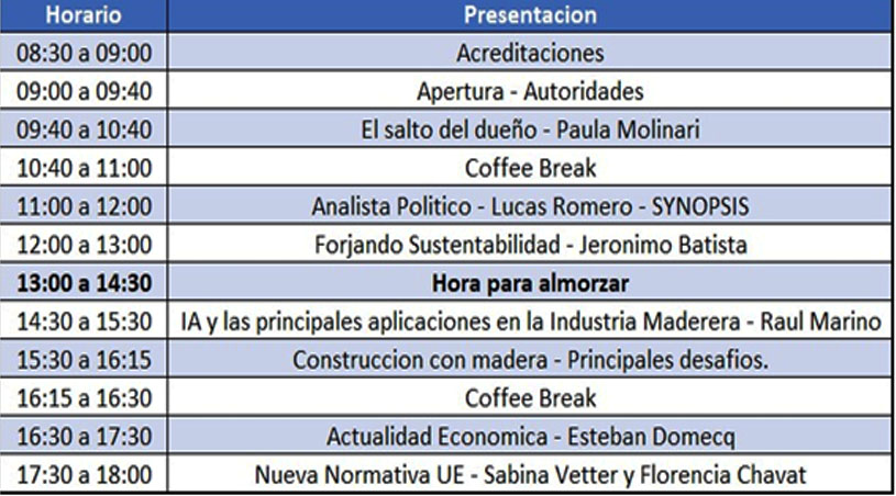 Se reunirán las más importantes voces y protagonistas vinculados a la madera argentina. Un día completo para debatir, analizar y conocer más sobre una industria que tiene el potencial de motorizar la economía nacional. Se abordarán temas de gestión empresaria, sustentabilidad, mercados, inteligencia artificial y tecnologías en la industria de la madera, construcción con madera, entre otros temas de actualidad económica.