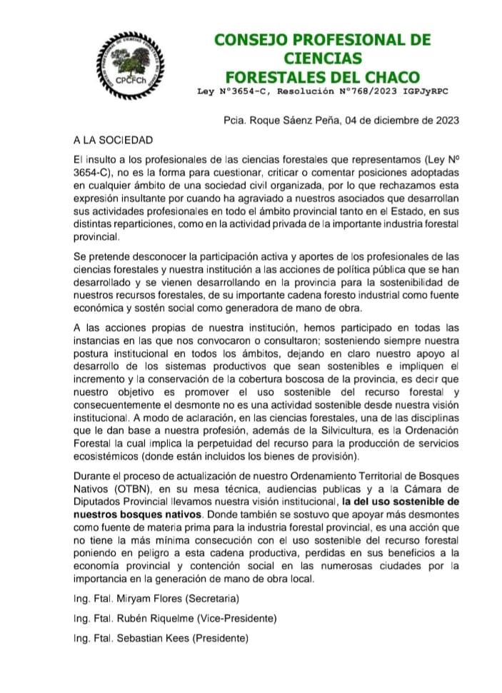 “Reiteramos nuestro apoyo a lo/as ingeniero/as forestales del Chaco, y a todos aquellos que trabajan incansablemente para promover prácticas sostenibles y un desarrollo equitativo en la industria forestal”, concluyeron en el comunicado de prensa.