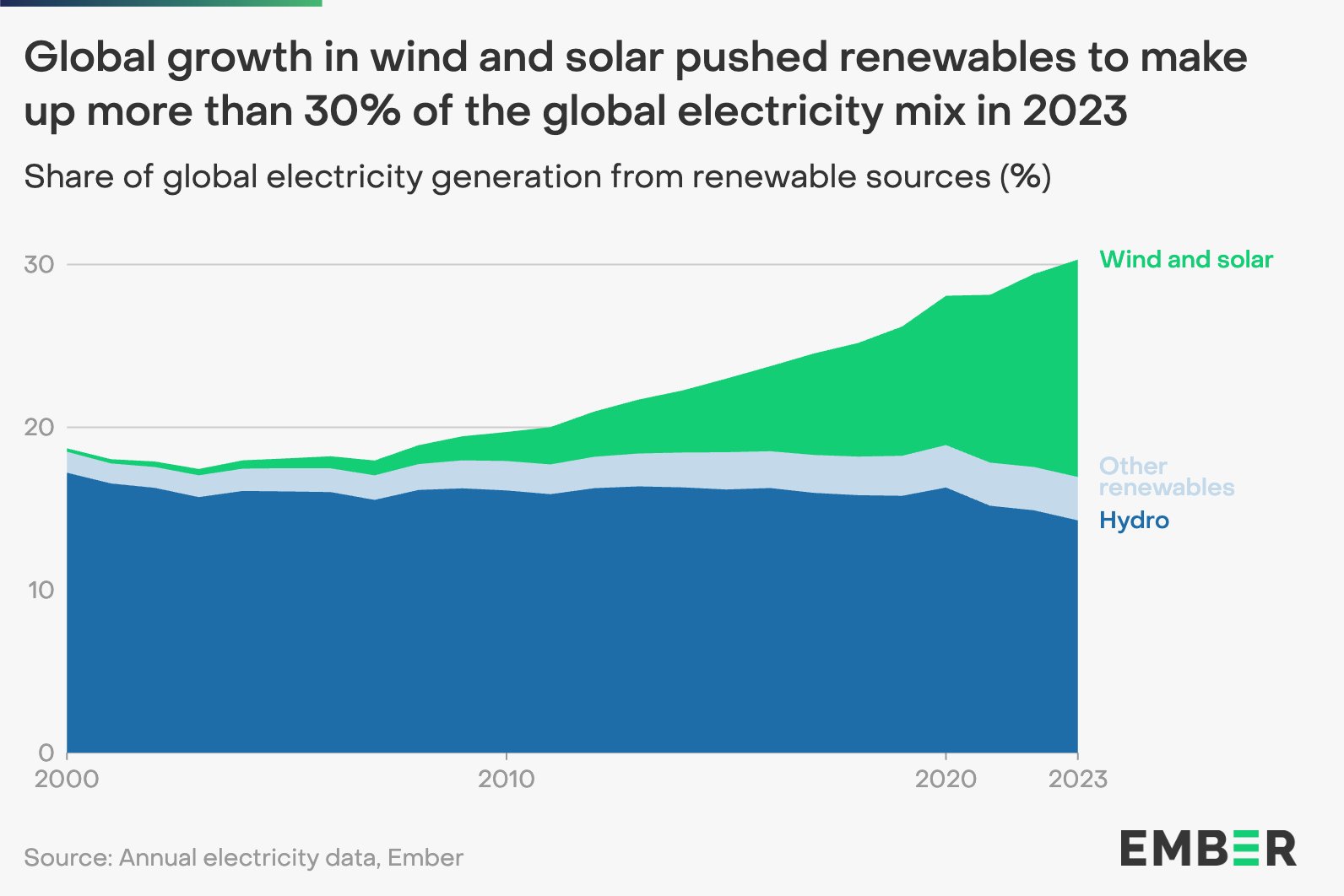 Desde 2000, las energías renovables se han expandido del 19% a más del 30% de la electricidad mundial, impulsada por un aumento de la energía solar y eólica del 0,2% en 2000 a un récord del 13,4% en 2023.