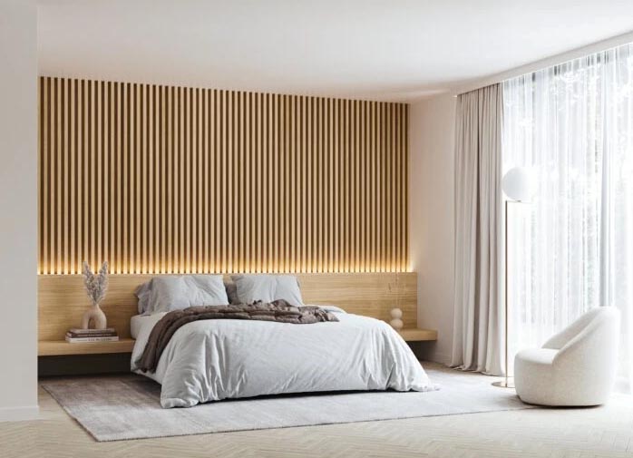 Crear una pared acentuada con listones de madera puede añadir profundidad y textura, proporcionando un punto focal moderno y acogedor. - Separadores de ambientes