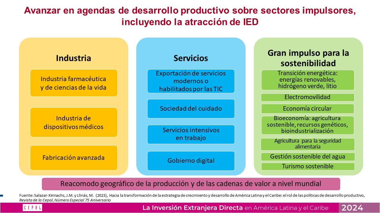 Asimismo, es importante focalizar la atracción de la IED hacia sectores o áreas consideradas prioritarias para el desarrollo productivo sostenible de la región. La CEPAL ha propuesto al menos 14 sectores impulsores en la industria, los servicios y en áreas relacionadas con el Gran Impulso para la Sostenibilidad.