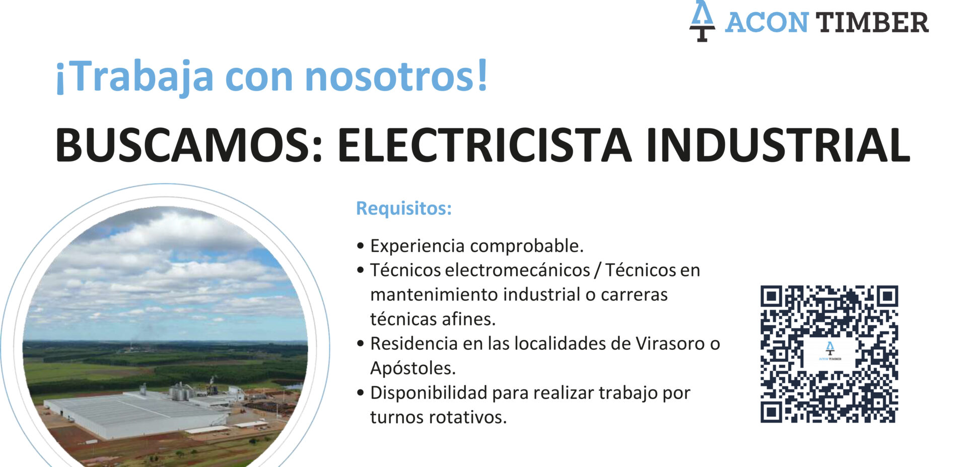 Aserradero Acon Timber ofrece una posición para Electricista Industrial en Apostoles, Misiones, o Virasoro, Corrientes. El candidato debe estar dispuesto a radicarse en alguna de estas localidades.