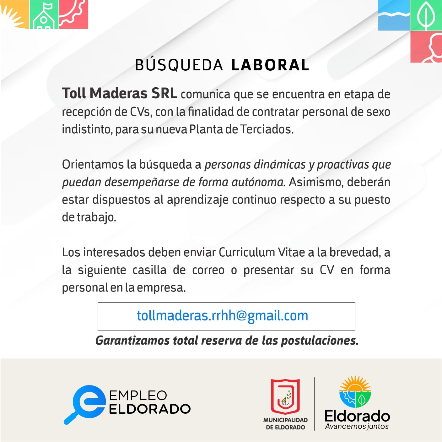 Toll Maderas SRL, con sede en Eldorado, ha iniciado la recepción de currículums para la contratación de personal en su nueva planta de terciados. La empresa está interesada en personas dinámicas, proactivas y con disposición para el aprendizaje continuo. Se buscan perfiles de género indistinto para diversas posiciones. Los interesados pueden enviar su CV a tollmaderas.rrhh@gmail.com o presentarlo en persona en la planta.