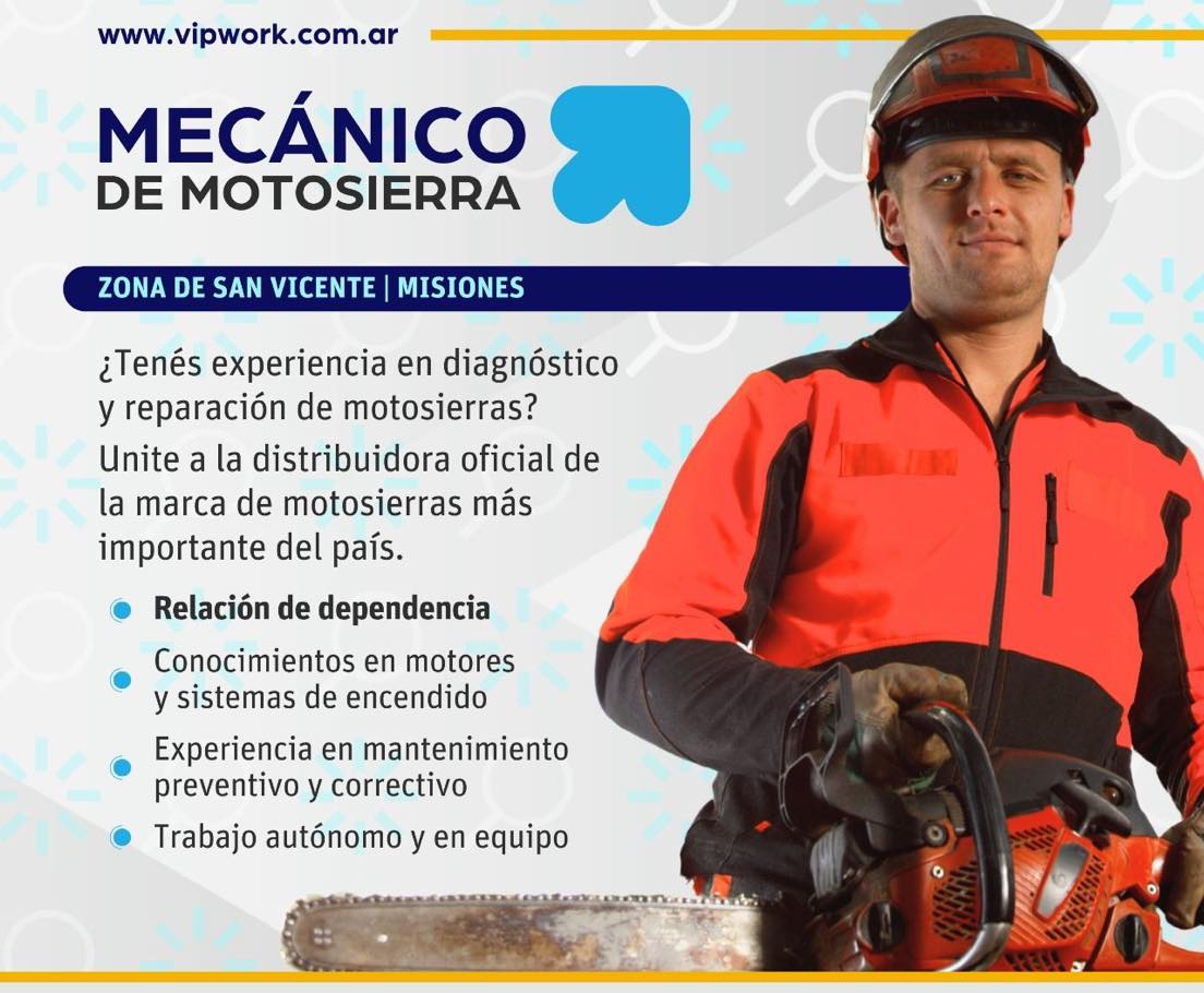 Se encuentran en la búsqueda de un Técnico especializado en mantenimiento de motosierras para trabajar en la zona de San Vicente. Este rol es crucial para el mantenimiento de equipos utilizados en las operaciones forestales. Postúlarse en postulaciones@vipwork.com.ar