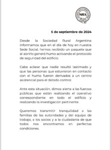 El presidente y vicepresidente de la Sociedad Rural Argentina (SRA) transmitieron tranquilidad tras el grave incidente ocurrido en la sede del barrio porteño de Palermo, tras recibir un paquete que generó una pequeña explosión en las oficinas de la entidad. “Estamos todos bien”, comunicaron desde la SRA. Si bien no se registraron heridos de gravedad, el hecho generó una gran repercusión, con reacciones de repudio y expresiones solidaridad.