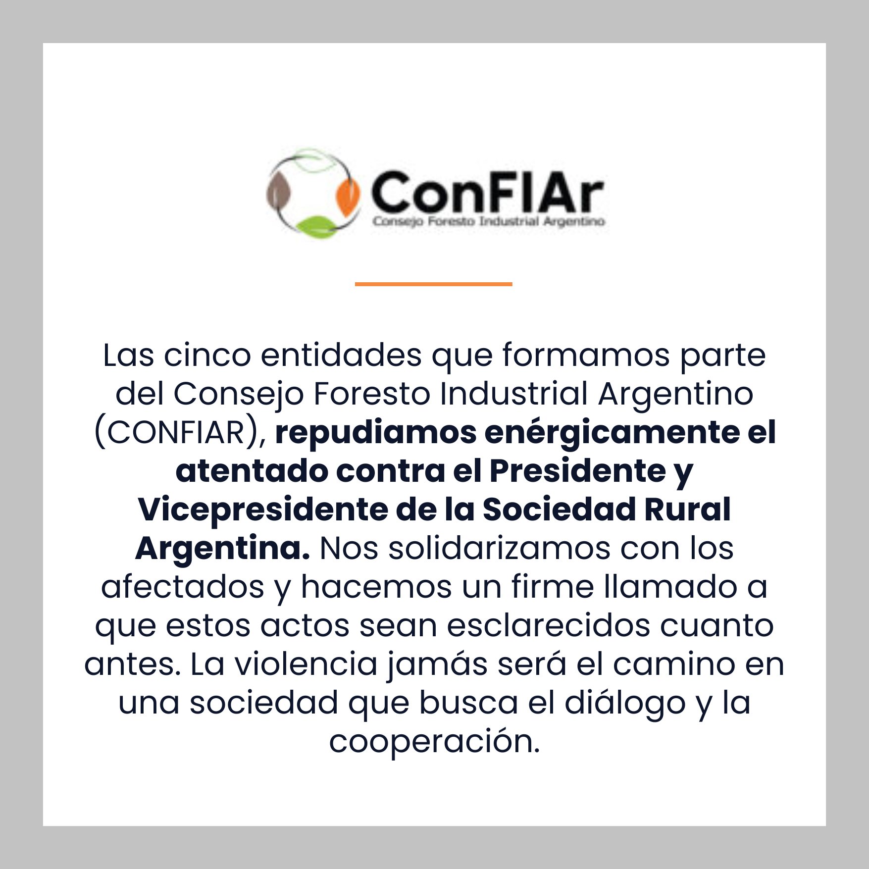 En esa línea, se expresó el Consejo Foresto-industrial Argentino: “Las cinco entidades que formamos parte de CONFIAR (AFCP, AFoA, ASORA, FAIMA y SRA), repudiamos enérgicamente el atentado contra el presidente y vicepresidente de la SRA. Nos solidarizamos con los afectados y hacemos un firme llamado a que estos actos sean esclarecidos”